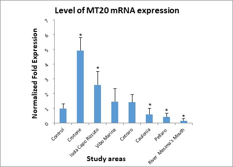 Regarding the gene isoform MT20, the highest levels of expression were found in the study areas: Crotone (4.92 Normalized Fold Expression) and Isola Capo Rizzuto (2.59 Normalized Fold Expression).