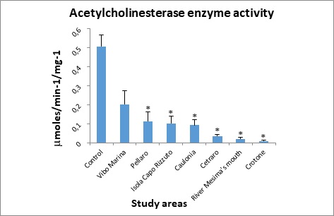 At each station, the AChE activity was less than control but, by the statistical test used to analyze the experimental data, the value observed in Vibo Marina station was not considered statistically significant.