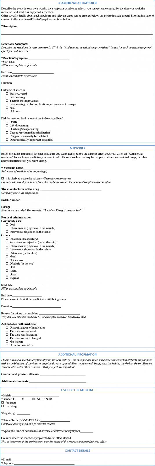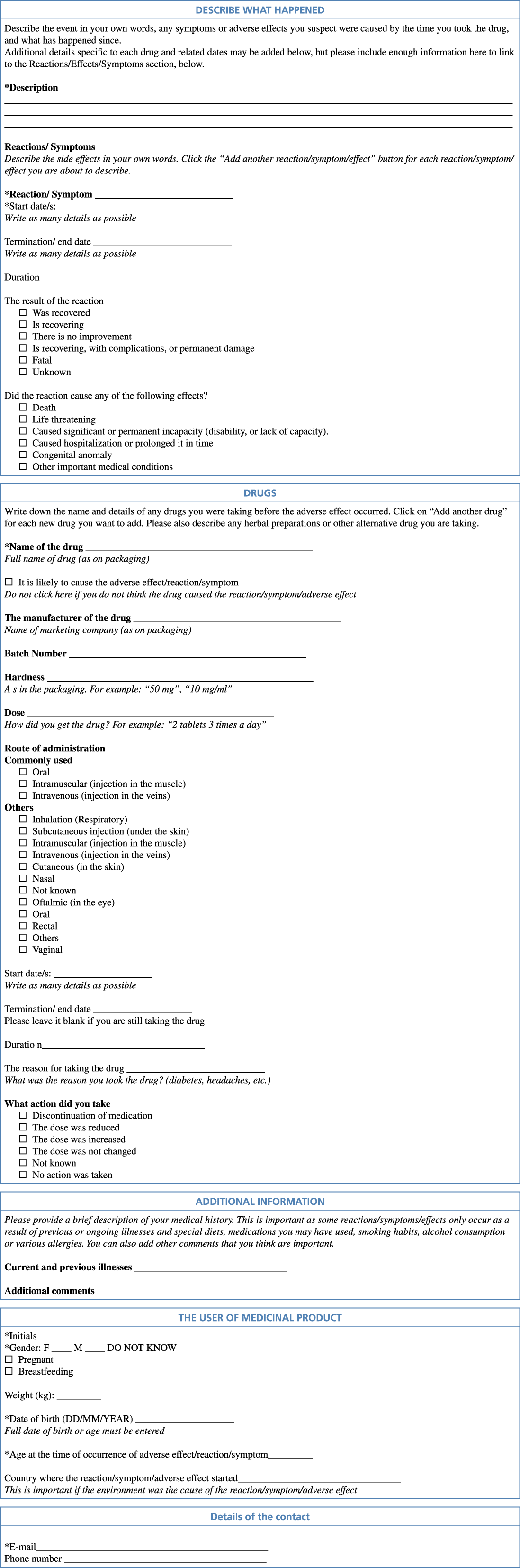 Figure 1. ADR reporting form for patients. (*) Obbligatory fields