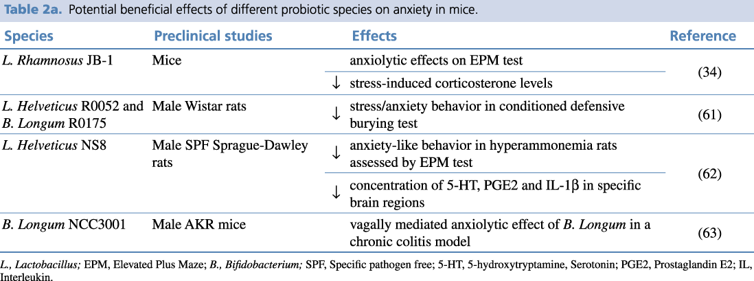Table 2a. Potential beneficial effects of different probiotic species on anxiety in mice.