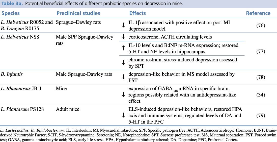 Table 3a. Potential beneficial effects of different probiotic species on depression in mice.