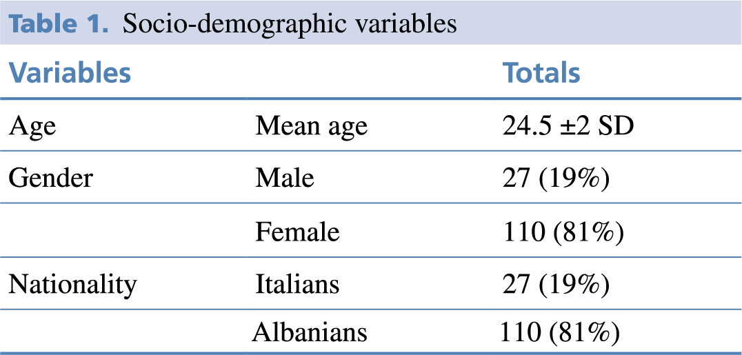 In total, 137 medical students enrolled in the 2017/2018 and 2018/2019 academic years took part in the survey (27 males and 110 females). Among them, 27 (19%) were Italians and 110 were Albanians (81%). The mean age was 24.5 years ± 2 SD. (range: 22-37 years).
