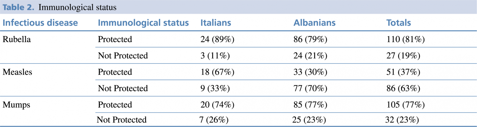 In the present study, the immunization rate of subjects was less than 70%, raising concerns regarding the risk of nosocomial measles infection for these workers.27-29 The effectiveness of the MMR (measles, mumps, and rubella) vaccine may vary depending on the specific strain of circulating viruses. Variations in strains can affect the vaccine’s ability to offer complete protection against these diseases. For example, the effectiveness of the MMR vaccine, containing the Jeryl Lynn strain, for the prevention of mumps is 72% with a single dose and 86% with two doses. Therefore, it is important that vaccines are formulated to cover the most common viral strains circulating in a given geographic region in order to maximize the effectiveness of vaccination. In Italy, there is no mandatory national measles vaccination policy for medical students and healthcare workers, except in two Italian regions, and non-immune people are sometimes offered vaccination in the workplace, but more often they are referred to a public service immunization program, resulting in a delay or failure to administer the vaccine. In Albania there is no vaccination policy for medical students as well. In a previous study, direct vaccine administration was shown to be more effective and cheaper than other strategies.30 Maintaining routine coverage of at least 95% will stop transmission of the virus, so raising awareness among stakeholders and HCWs of the risk of the disease is crucial. The elimination of this pathology is possible thanks to the presence of vaccines which, however, must be administered adequately. It is estimated that 95% of the population needs to be vaccinated with two doses of measles vaccine to achieve protection of the entire population and prevent outbreaks. Given the inadequate vaccination coverage in Italy and Albania and the circulation of the measles virus, we recommend vaccination in childhood according to the vaccination calendar, serological evaluation and possible vaccination for HCWs who do not declare this type of vaccination or do not have protective antibody titers.31 This strategy has been found in previous studies to be highly effective from a cost and savings point of view.32 Our study shows that 18 women are not protected from rubella. This information is concerning and indicates a potential risk of disease for these female students in case of future pregnancy.