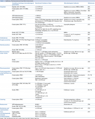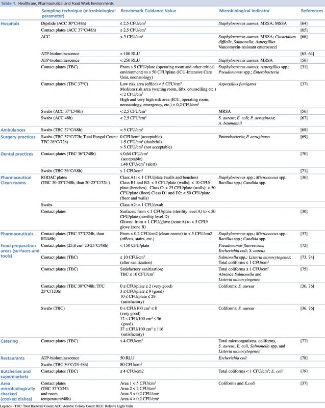 The literature on the quantitative evaluation of the levels of microbial contamination of the surfaces does not report standards or legislative references.62,63 The reported values are mostly finalized to estimate the cleaning efficacy of sanitation actions or to quantify and provide a general measure of bacterial load. Table 1 summarizes the benchmark values proposed by several authors in Healthcare, Pharmaceutical and Food work environments.