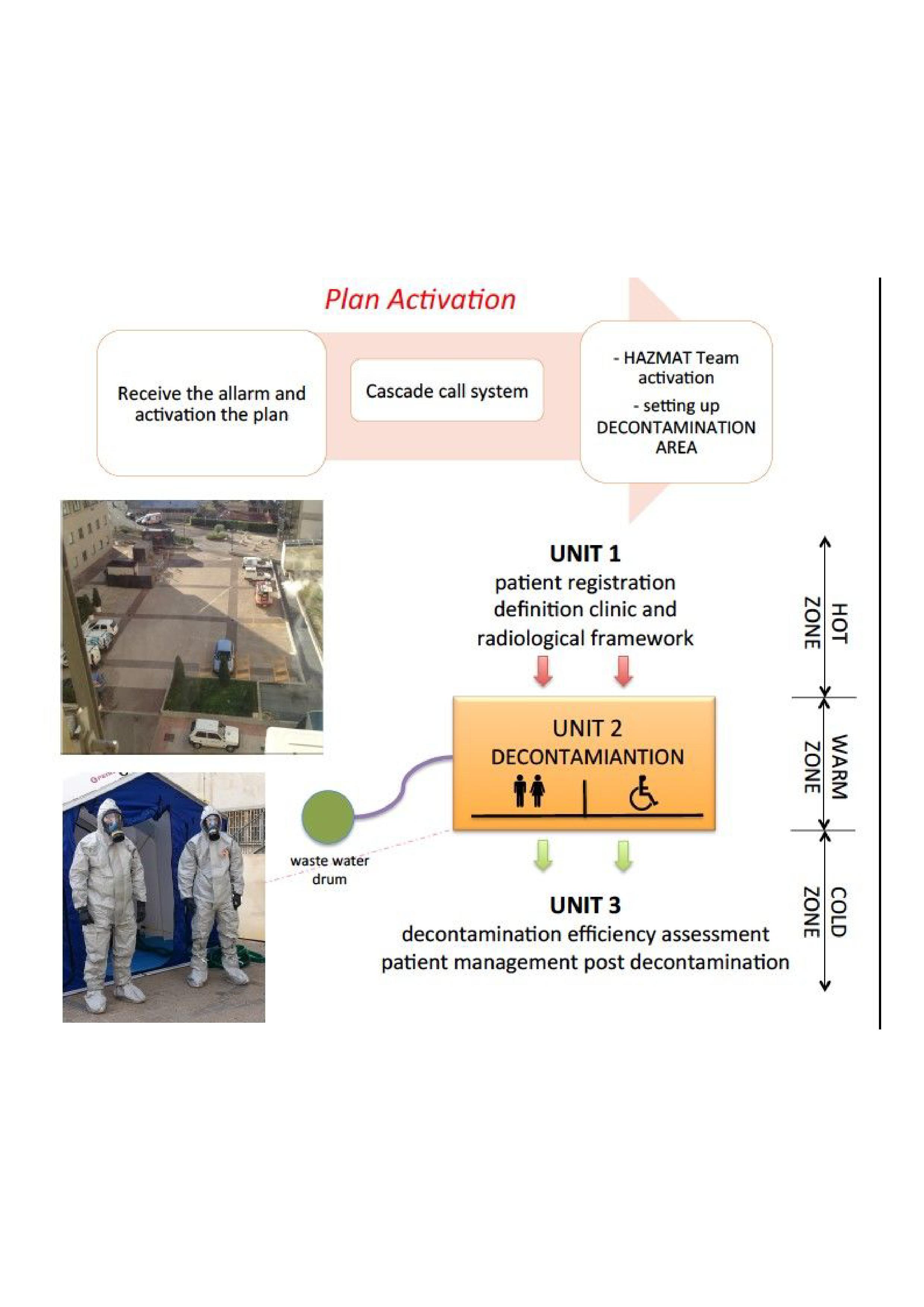 Inside the tent, the patient is undressed and decontaminated with warm water and soap; in the case of superficial wounds, the area is irrigated with saline solution or for transuranic contamination directly with chelation solutions that favor the removal of the contaminant. In the event of a serious clinical condition, the patient is transported to the hospital in the surgery room with dedicated paths.