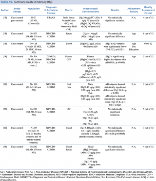Eight studies evaluated the difference in mercury concentration between subjects diagnosed with Alzheimer’s disease and healthy patients, as shown in Table 10. Among the five articles assessing blood levels,14,16,19,26,52 only one19 showed statistically significant variations (an increase) in metal levels, while the others found no substantial difference between cases and controls.