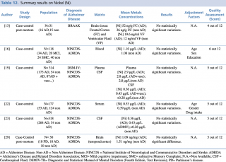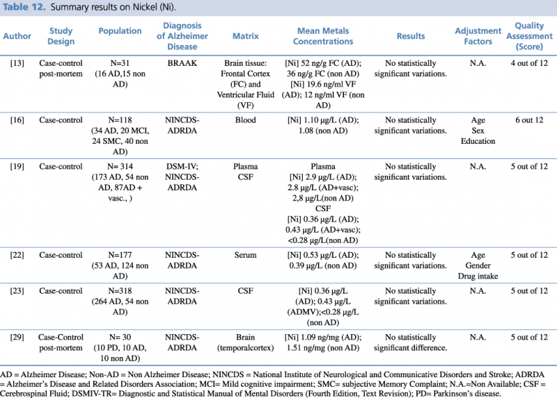 As shown in Table 12, six studies assessing differences in nickel concentration between AD and non-AD subjects met the eligibility criteria.13,16,19,22,23,29 Independently from the biological matrix evaluated (plasma, serum, cerebrospinal fluid, brain tissue) no significant variation between patients with diagnosis of Alzheimer’s disease and healthy controls was found.