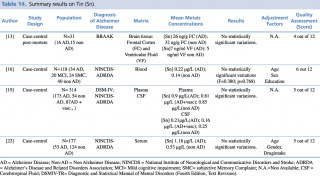 As shown in Table 15, four articles met the eligibility criteria.13,16,17,19 The study by Paglia et al., carried out on 118 subjects (34 AD, 20 MCI, 24 SMC and 40 non-AD), showed a significant decrease (p< 0.001) in vanadium blood levels in AD subjects.