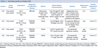 As shown in table 2, an overall number of four studies evaluating arsenic concentrations in biological matrices were considered eligible. Three of the included studies14,15,16 were achieved on serum samples. Park et al. and Paglia et al. found no statistically significant difference (p=0.309 and p=0.312, respectively) in metalloid concentration between AD subjects and healthy controls in two large populations of 207 (89 cases and 118 controls) and 118 subjects (34 AD, 20 MCI, 24 SMC, and 40 non-AD) respectively. A similar result occurred in Baum research: among the 85 enrolled subjects, 44 with a diagnosis of Alzheimer’s disease and 41 healthy controls, there were no relevant differences in arsenic blood concentration between the two groups: a mean level of 35.7 nmol/L in AD subjects compared with 38.7 nmol/L in healthy controls. A post mortem case control study13 carried out by Szabo et al. on 31 brain samples showed significantly lower concentration both in frontal cortex and in ventricular fluid brain regions (p=0.033 and p=0.044, respectively) of AD patients when compared with non-AD subjects (frontal cortex: 145 ng/g vs 159 ng/g; ventricular fluid: 18 ng/ml vs 13 ng/ml, respectively).