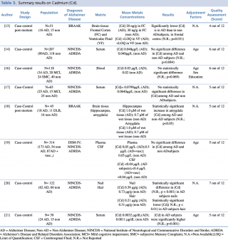 Among the five studies assessing cadmium concentration in blood samples of patients with Alzheimer’s disease compared with healthy controls, no significant differences emerged between the two groups (p>0.05). Only one paper21 reported different results, showing a statistically significant (p=0.001) increase in cadmium levels among AD patients. Of note, this study included only 39 subjects, having the smallest size among the considered studies. Only one study19 investigated variations in cadmium cerebrospinal fluid level, showing no statistically significant difference between AD and non AD subjects.