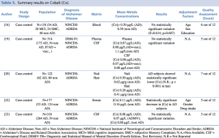 As shown in Table 5, three studies16,19,22 focused on blood samples (plasma and serum). Alimonti et al. found a significant decrease in serum cobalt among AD subjects in a population of 177 (53 AD and 124 controls), while the studies carried out by Gerhardsson et al. in 2008 and by Paglia et al. in 2016 showed no substantial changes in metal concentration between the two groups. A recent case control study (2017) by Koseoglu et al. focused on Co levels in other biological matrices, hair and nails. The research was undertaken on 122 subjects (62 AD and 60 non-AD) and showed a statistically significant decrease in cobalt concentration (p < 0.001) among AD patients in hair. On the contrary, no real variations emerged by comparison of nail samples between the two investigated groups.