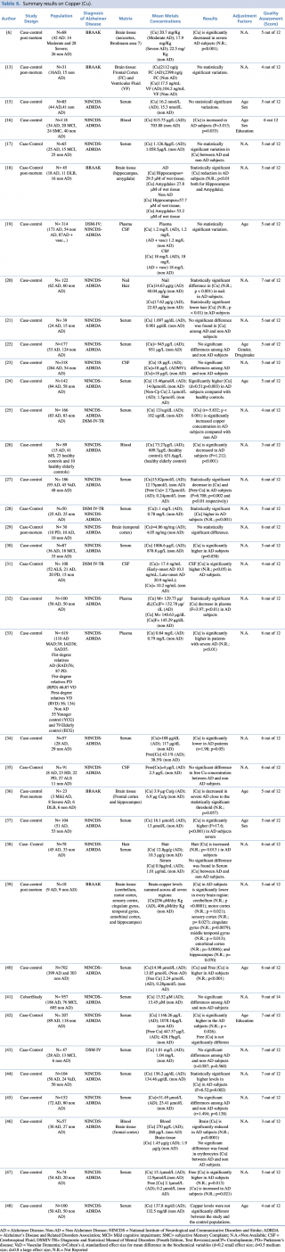 Copper is the most widely investigated metal, with 36 studies assessing its concentrations in different biological matrices (blood, cerebrospinal fluid, hair, nails and brain tissue). As shown in Table 6, most studies assessed copper levels in blood, serum or plasma. The results were extremely variable with 42% of the studies (N=11) showing a significant increase in total and free copper in AD subjects compared with non-AD, 42% (N=11) showing no statistically significant difference between the two groups, and 16% (N=6) showing a significant decrease in AD patients. Also the most robust study in terms of sample population19,33,40,43 gave no univocal results. It must be pointed out that the number of subjects included in studies showing decreased concentrations was generally much lower than in studies showing an increase or no difference. Concerning cerebrospinal fluid, three case control studies19,23,35 found no substantial difference in CSF copper concentration between AD subjects and healthy controls   whereas only one study31 showed significantly higher copper levels amongst cases compared with the control group.