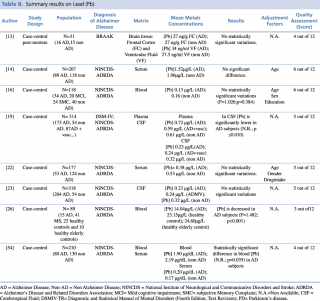 Eight articles concerning lead concentrations in AD and non-AD subjects met the eligibility criteria, as shown in Table 8. Six case control studies, carried out on serum or plasma samples, showed discordant results. Giacoppo et al., in their research on 89 AD and non-AD subjects, found a statistically significant decrease in blood lead levels (p<0.001) in patients with Alzheimer’s disease. The study by Lee et al., carried out in 210 subjects: 80 with a diagnosis of Alzheimer’s disease and 130 without, identified a significant reduction in blood lead concentrations between AD and non-AD subjects (p=0.035). Conversely, the same study also reported an increase in lead levels of patients with Alzheimer’s disease (0.20µg/dL compared with 0.17 µg/dL in the control group) when the evaluation of metal concentration was determined on serum samples.