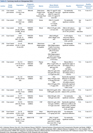 As shown in Table 9, twelve articles concerning manganese concentration in biological matrices met the eligibility criteria. Six case-controls studies tested differences in blood metal levels, reporting discordant results. Baum et al. and Alimonti et al. didn’t report any significant variations in serum between AD subjects and healthy controls.