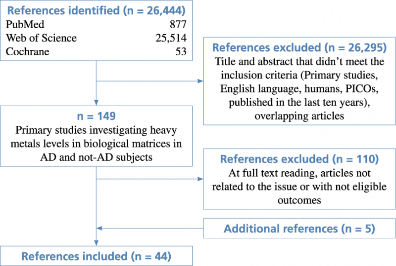 The most part of the 44 eligible studies investigating difference in metals concentration reported no univocal outcomes.57 Only some elements gave a clear tendency of results. Chrome, molybdenum, nickel and tin showed no real difference between AD and non-AD subjects, irrespectively to the biological matrix evaluated.