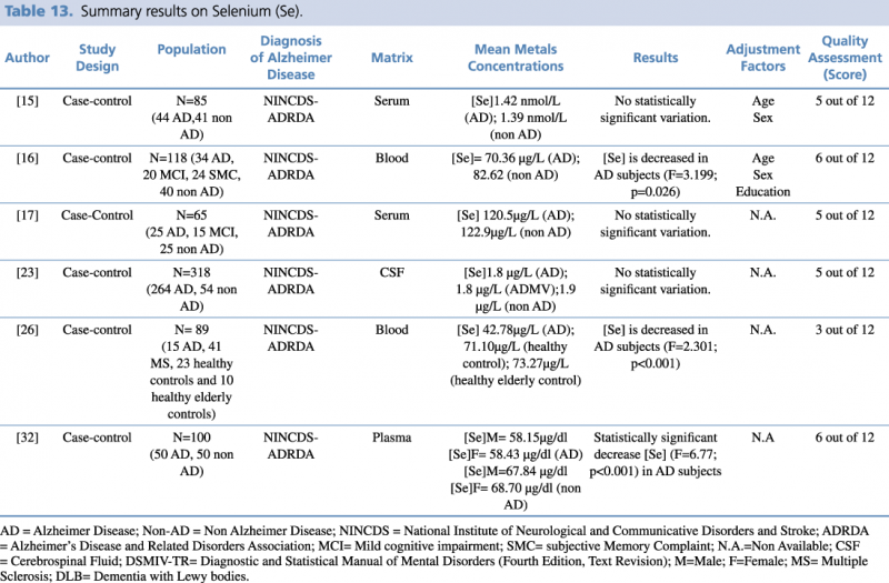 Six articles evaluated selenium levels in patients with diagnosis of Alzheimer’s disease and healthy controls (Table13). Differences in metal concentrations were assessed in two biological matrices: blood and cerebrospinal fluid.