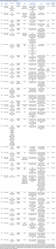 Finally, two studies19,23 assessing metal levels in cerebrospinal fluid on large population samples [N=314 (cases+controls) and N=318 (cases+controls), respectively] did not detect statistically significant differences between cases and controls.