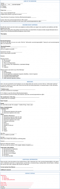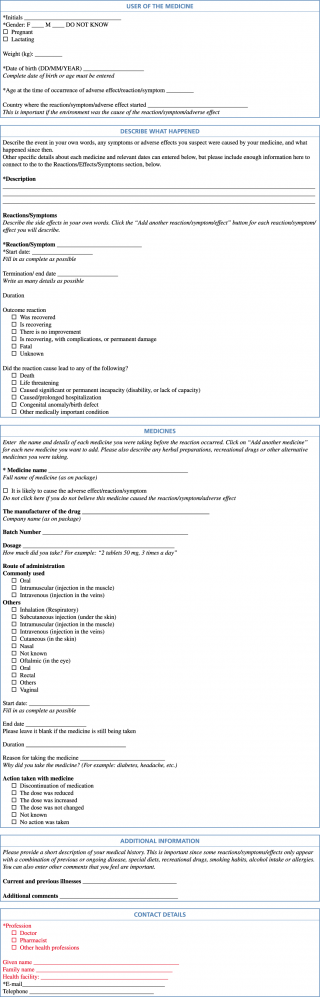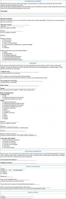 Many details are still missing in the ADR reporting form of patients, and health care professionals, such as data on the respective trimester of pregnancy (1st, 2nd, 3d trimester), date of last menstruation of the patient. Information whether the suspected drug was taken in the past, and if it has caused the same reaction, should also be reported. Data on whether the adverse effect is a result of the incorrect use of drug (dose error, or wrong route of administration, or drug overuse) should be reported. Information whether other drugs were used to treat the reported adverse effect should also be included.
