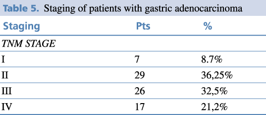 Regarding the UICC TNM stage classification, TNM, advanced stage was the most frequent as shown in Table 5. According to the histopathological findings, 32.5% of the patients are in stage III and 21,2 % stage IV.