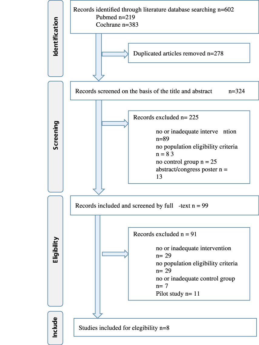 The two-database search identified 602 articles totally, and after duplicated removal, 324 were considered for selection about title and abstract. Through the reading of title and abstract, 225 articles were excluded, and 99 were retrieved for full-text assessment of eligibility. Eight studies met the inclusion criteria and were included in this review.