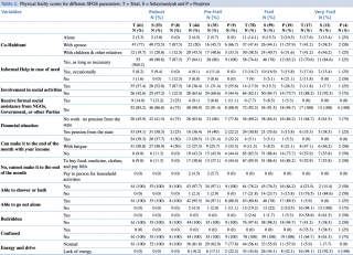 The prevalence of physical frailty was investigated about some parameters documented in Table Ⅱ. Most of the older adults’ population (92.3%, n. 72) did not receive formal social assistance from NGOs, Government, or other people, posting frailty scores in Sulaymaniyah and Penjwen of 91.5% and 94.7%, p<0.01, respectively; scores were significantly higher in the rural area.