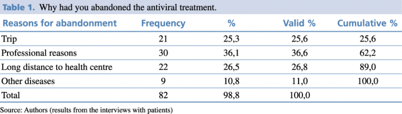 In Table 2, the results of the interviews of the health professionals show a different scenario. Lack of food or hunger have been identified and described as key problems (42,9%) for abandonment, followed by low cultural level/illiteracy and nomadism. In the experience of professionals, stigma and bad quality of care do not appear significant reasons.