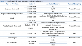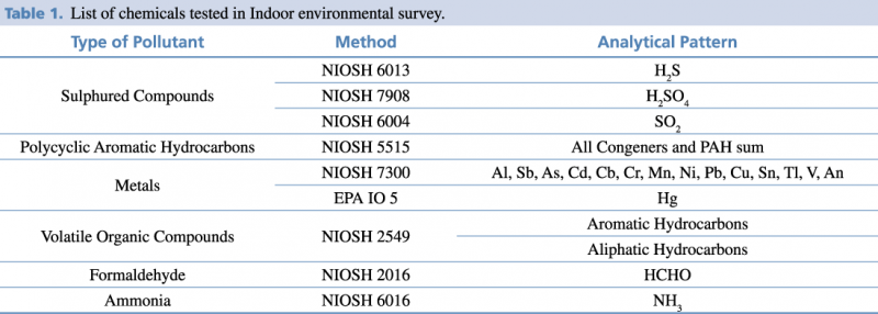 To examine the sampling results, we compared data on each of the maximum values for the different chemicals that were sampled in the three different studies to threshold limit values (TLVs) established by the American Conference of Governmental Industrial Hygienists.5,6 For the chemicals where there were defined TLVs, there were no exceedances of TLVs. However, there were many chemicals without a defined TLV, so those could not be compared to the occupational exposure level. The Industrial Hygienist team carried out all of the sampling for the chemicals in the three studies. Our analysis operates under the assumption that the Italian Industrial Hygiene Company team used validated, appropriate, and up to date sampling methods from NIOSH or other comparable regulatory agencies, and that they carried out all of the sampling in strict accordance to the methods.