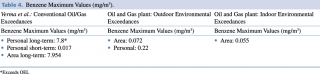 We also conducted a literature review to identify additional publications on exposure levels for employees working at upstream petroleum plants. There were a few studies that focused on various health outcomes associated with occupational exposures, but we did not find a large number of studies that reported exposure levels. There was one comprehensive study by Verma et al. from 2000 titled Benzene and Total Hydrocarbon Exposure in the Upstream Petroleum Oil and Gas Industry, and we will use this study and their findings as a benchmark and guide to analyse the Oil and Gas center sampling results. Verma et al. focused on benzene and hydrocarbons, reporting maximum values for these chemicals and the percentages of their samples that exceeded occupational exposure limits.7